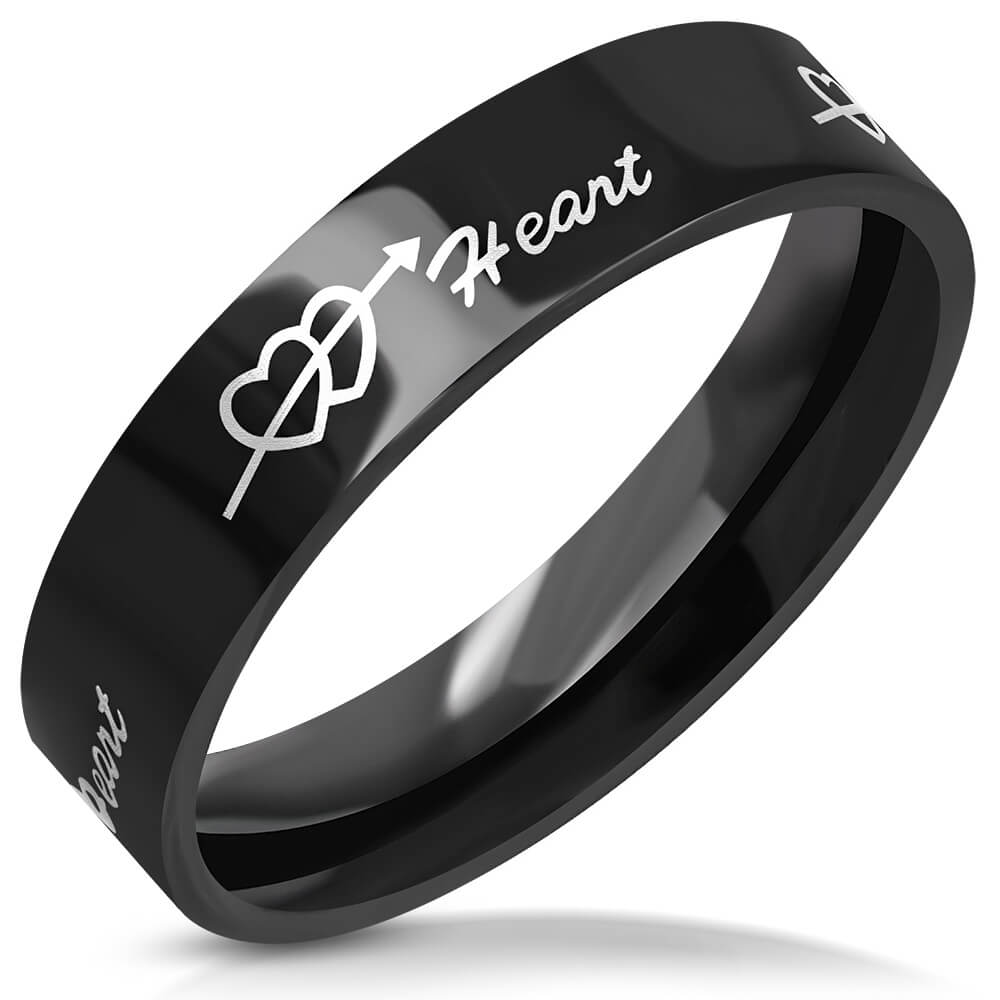Nádherný zrkadlovo lesklý prsteň z chirurgickej ocele v čiernom farebnom prevedení. Prsteň zdobí nápis HEART so symbolom srdiečok preťatých šípom.
