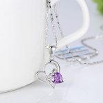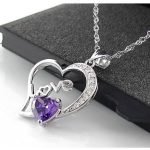 Dámsky náhrdelník Srdiečko so zirkónmi pozostáva z jemnej retiazky s hranatým vzhľadom, ktorú zdobí prívesok v tvare srdca s fialovým zirkónom a nápisom LOVE.